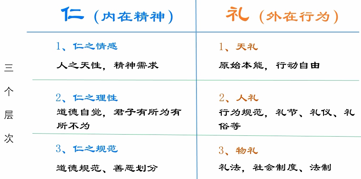 要弄清楚仁礼观的含义,首先要了解仁礼观的三个层次,下面分别对仁和礼的三个层次的含义进行分析,如下图: