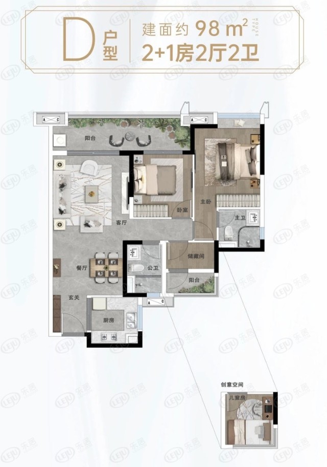 同时,从阳台往外望去,附近的景色也能尽收眼底。此外,该户型还有一个可供改造的创意空间,可以改造成储藏室或者游戏间。