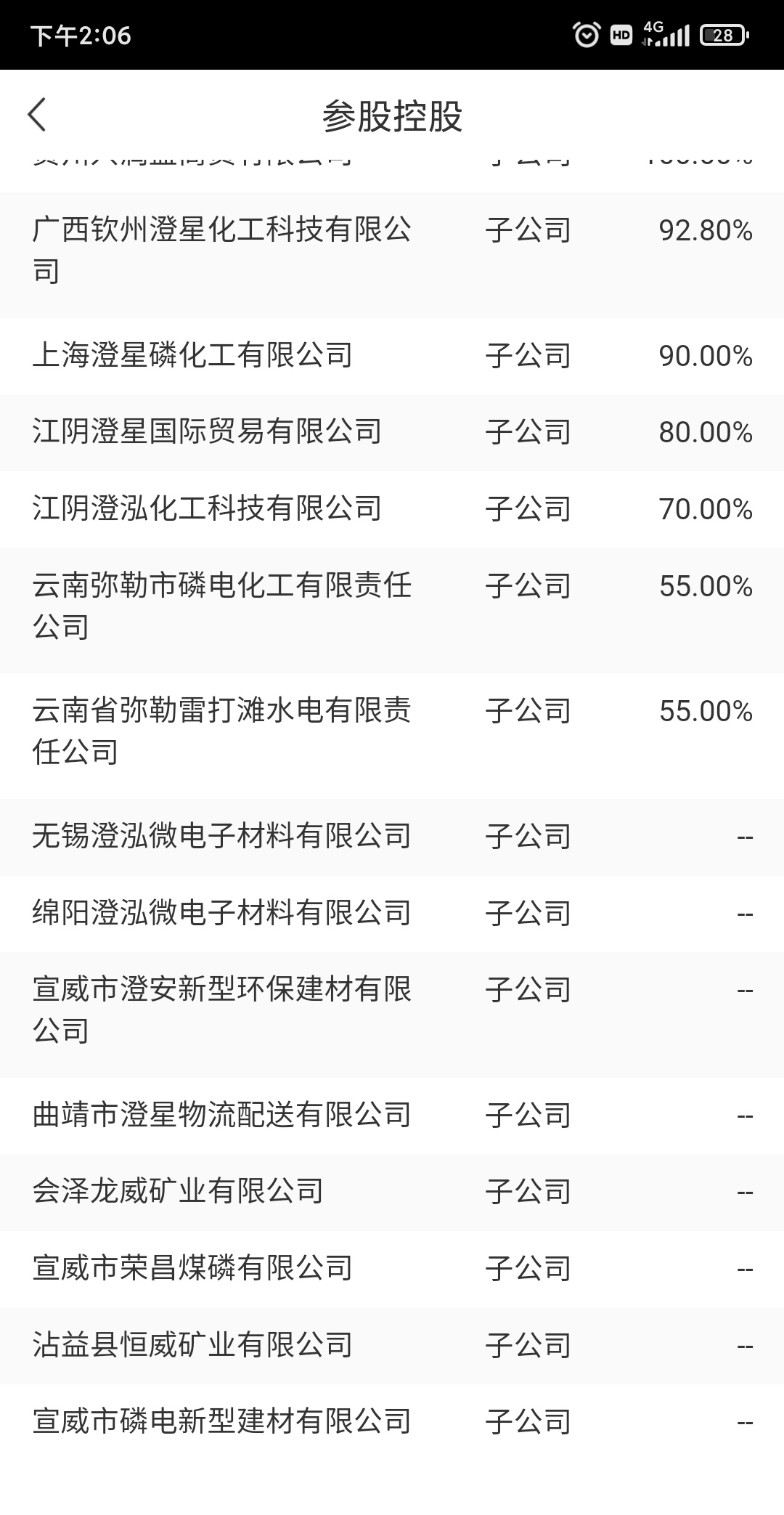 澄星股份子公司控股情况有变, 会泽 宣威 沾益这3个事澄星主要磷矿,不知为啥突然没有持股比例的显示了