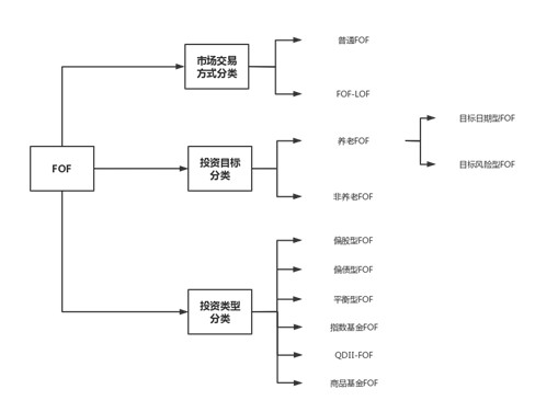 FOF产品可以通过不同的市场交易方式、投资目标、投资类型维度划分成不同的类型。