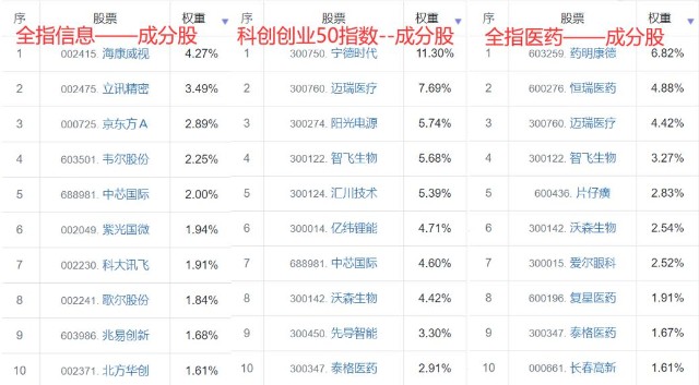 没有关系,把组合调整成:全指信息+科创创业50+全指医药,三者互补,即完成了创业板和科创板这类宽基的配置,又完成了科技和医药的行业配置,我继续将他们的成分股放出来。