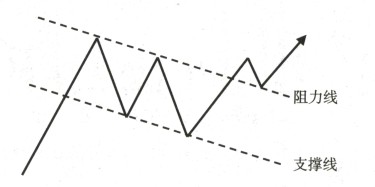 旗形是与楔形相似的一种形态,二者的区别在于支撑线的倾斜角度。也 就是说,旗形的两条边线近似平行线,这是与楔形最显著的区别。如图 所示。
