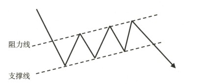 第四,股价向下跌破下降旗形的下边线,意味着股价已经走出了振荡区 域,未来股价下跌的概率极大。此时下边线先前所具有的支撑作用将会转为 阻力作用,当股价跌破下边线后出现反弹,其反弹至下边线位置时,会因下 边线的阻力而重新下跌,此时就是该股最后一个出货机会。如图所示。