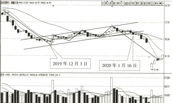 如图所示,2019年12月到2020年1月,新疆火炬的日K线图上 出现了下降旗形形态。