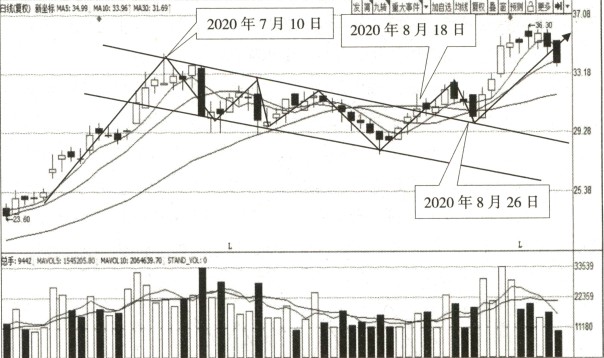 如图所示,2020年7月到8月,新坐标的日K线图上出现了上升 旗形形态。