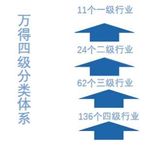 Wind的行业标分类以全球行业分类系统(GICS)为基础,采用的是四级行业分类体系,其中包括11个一级行业、24个2二级行业、62个三级行业以及136个四级行业。