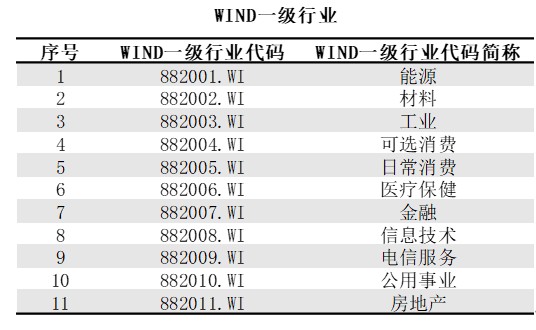 WIND一级行业中包含11个行业大类,分别是能源、材料、工业、可选消费、日常消费、医疗保健、金融、信息技术、电信服务、公用事业以及房地产。