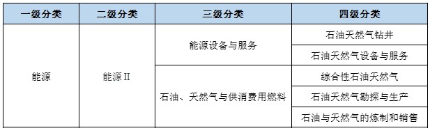 能源行业细分为1个能源二级行业、2个能源三级行业以及5个能源四级行业,主要涉及石油与天然气的开采与消费,煤炭、核电等其他能源不归于一级能源行业。