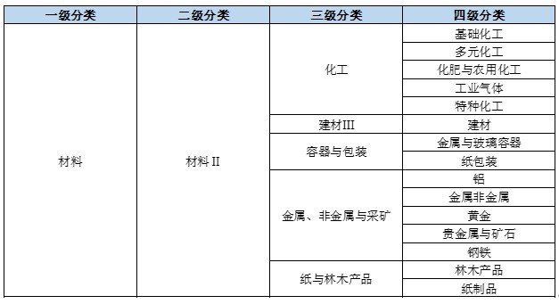 材料行业细分为1个二级行业、5个三级行业以及15个四级行业,主要涉及化工、建材、金属、纸制品等。