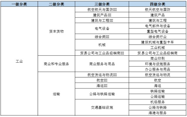 工业具体细分为3个二级行业、13个三级行业以及20个四级行业,主要包括机械、航天航空、建筑、贸易、铁路公路、机场服务等。