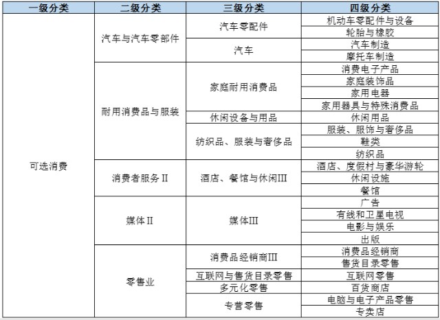 可选消费细分行业较多,包括5个二级行业、11个三级行业以及25个四级行业,涵盖汽车、家用消费、休闲消费、纺织、旅游、媒体以及零售等细分板块。