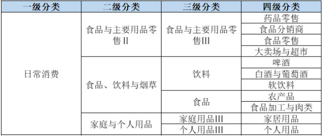日常消费类别相对较少,包括3个二级行业、5个三级行业以及11个细分行业,涵盖烟酒、肉食、药品等常用消费行业。