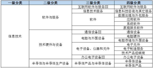 信息技术行业细分为3个二级行业、8个三级行业以及15个四级行业,主要包括通信硬件与软件,如半导体设备、互联网服务、电脑设备、电子元器件等。