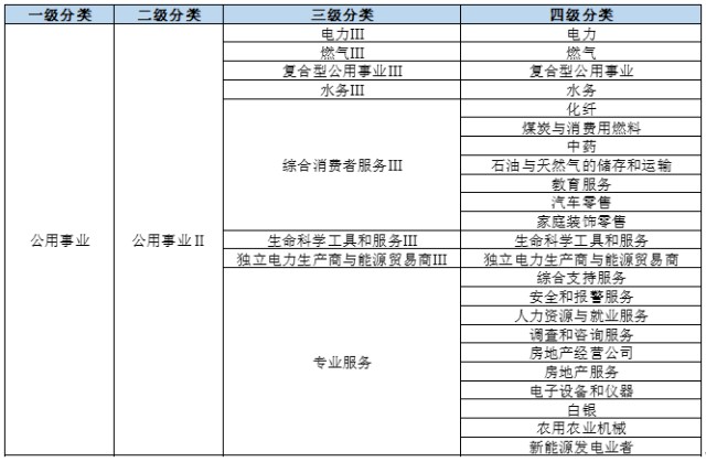 由于中国是以公有制经济为主体,所以公用事业较多,涵盖范围较广。包括1个二级行业、8个三级行业,以及23个四级行业,涉及到能源(电力)供给、水务、综合服务以及专业服务。