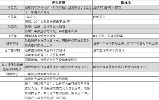 旧的退市标准中,最核心的指标是连续三年亏损,进入退市流程;而新标准的核心指标是连续两年亏损(归母净利润和扣非净利润孰低)且营收低于1个亿。