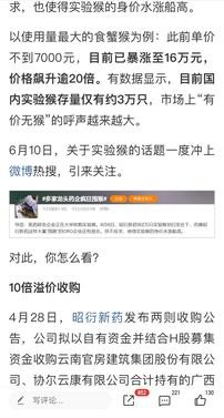 这是开始炒猴了,你考虑过猴的感受吗! 医药研发企业正在大举收购实验猴。实验猴一只或涨至16万!医研企业大举收购 国内存量仅约3万只。