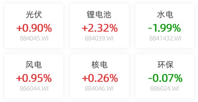 今日中证环保指数微涨0.17%,锂电池板块逆势走强,上涨2.32%,风电、光伏皆有所表现,分别上涨0.95%、0.90%。
