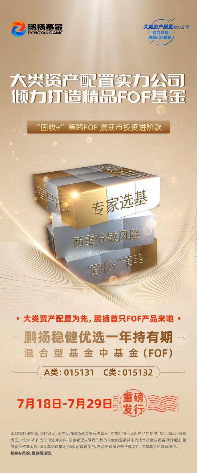 鹏扬稳健优选一年持有期混合型基金中基金(FOF)混合基金(A类:015131 C类:015132)首发募集期为7月18日-7月29日,是一只定位为“固收+”的混合型基金中基金。本基金设置一年持有期,买入资金逐笔锁定一年,期满后可继续持有或随时申请赎回,无赎回费。如此设置既保证了投资的相对灵活性,也鼓励持有人长期持有,力争提升投资胜率。