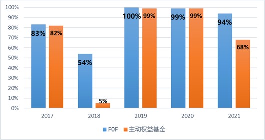 2017年以来FOF基金与主动权益基金的年度正收益比例