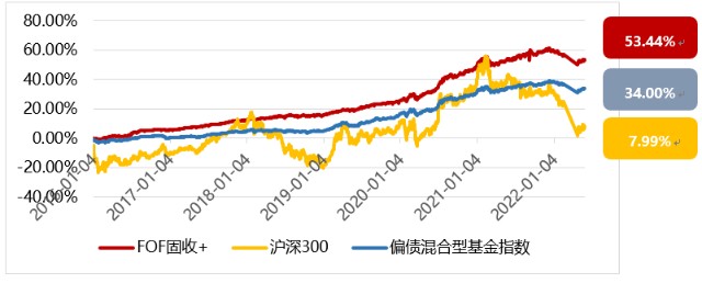 自2016年至今(2016/1/4-2022/5/31), FOF固收+策略指数累计涨幅为53.44%,同期偏债混合基金指数(885003.WI)涨幅为34.00%,沪深300指数涨幅为7.99%。