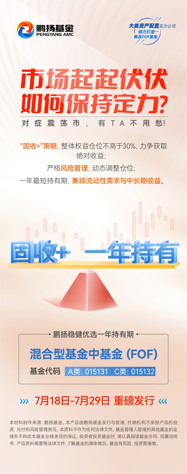 正值发售期的鹏扬稳健优选一年持有期FOF设置一年持有期,买入资金逐笔锁定一年,期满后可继续持有或随时申请赎回,无赎回费。兼顾投资者的流动性需求与追求中长期收益需求,保证了投资的相对灵活性,也鼓励持有人长期持有,力争提升投资胜率。