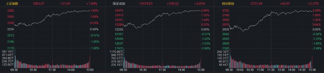 沪深两市早盘高开高走大幅收阳,全天北水呈净流入态势。截止收盘沪指涨1.6%,收报3281.67点;深证成指涨2.05%,收报12474.03点;创业板指涨2.37%报2721.49点。两市成交额超万亿元,超过上一交易日千亿。申万一级31个行业分类全部收阳,尤其非银金融大涨,沪港通今日净流入132.95亿元。