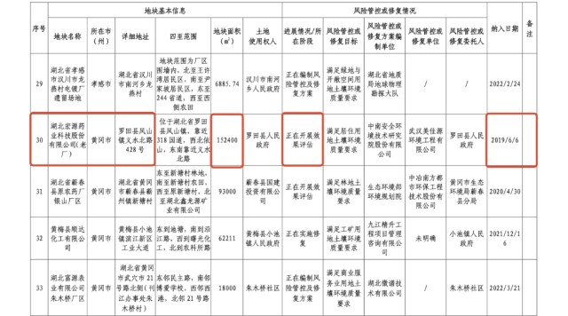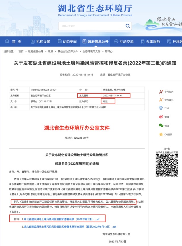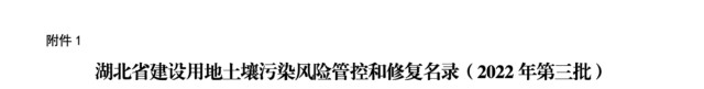 2022年6月13日湖北省生态环境厅办公室发布“鄂环办〔2022〕27号,湖北省生态环境厅办公室文件”,文件显示,“关于发布湖北省建设用地土壤污染风险管控和修复名录(2022年第三批)的通知。各市、州、直管市、神农架林区生态环境局:依据《中华人民共和国土壤污染防治法》《污染地块土壤环境管理办法(试行)》《建设用地土壤污染风险管控和修复名录及修复施工相关信息公开工作指南》等有关规定,结合近期全省建设用地土壤污染状况调查、风险评估、风险管控和修复效果评估报告评审情况,省生态环境厅更新形成《湖北省建设用地土壤污染风险管控和修复名录(2022年第三批)》(以下简称《名录》,附件1)和《湖北省建设用地土壤污染风险管控和修复名录移出清单》(截至2022年6月13日)(附件2),现予以发布。