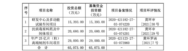 宏源药业此次拟向社会公开发行不超过4,725.72万股拟定募集资金65,073.00万元,主要用于三个项目分别为研发中心及多功能试验车间项目、抗病毒原料药及中间体项目、年产25亿片(粒)高端制剂车间项目。
