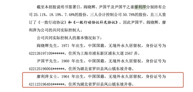宏源药业招股书(上会稿)显示,“尹国平、廖利萍与阎晓辉签订了《一致行动协议》和《一致行动协议补充协议》,三人为公司共同实际控制人。”在第十章节《董事、监事、高级管理人员及其他核心人员基本情况》董监高介绍中,详细披露尹国平、阎晓辉的任职履历。但是最实控人之一的廖利萍任职履历“疑似”空白。