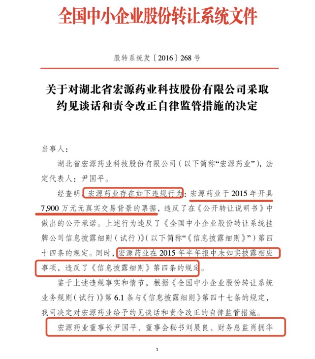 鉴于上述违规事实和情节,根据《全国中小企业股份转让系统业务规则(试行)》第6.1条与《信息披露细则》第四十七条的规定,我司决定对宏源药业给予约见谈话和责令改正的自律监管措施。宏源药业董事长尹国平、董事会秘书刘展良、财务总监肖拥华接受自律监管谈话。”