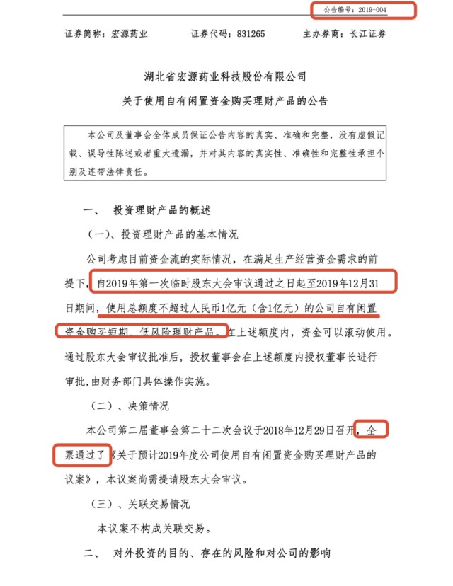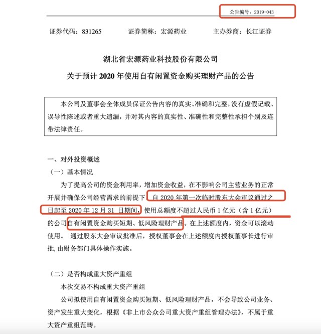 2019年12月25日宏源药业在公转系统发布公告《关于预计2020年使用自有闲置资金购买理财产品的公告》称,“为了提高公司的资金利用率,增加资金收益,在不影响公司主营业务的正常开展并确保公司经营需求的前提下,自2020年第一次临时股东大会审议通过之日起至2020年12月31日期间,使用总额度不超过人民币1亿元(含1亿元)的公司自有闲置资金购买短期、低风险理财产品。在上述额度内,资金可以滚动使用。