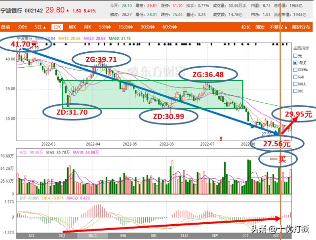 上图是宁波银行的日K线走势图。从图中的划分,我们可以清楚地看到两段走势,即【41.70-27.56元】的下跌走势和【27.56-29.95元】的上涨走势。前一段下跌走势有一个下降中枢【31.70-36.48元】,同时出现了盘整背驰和MACD底背离,所以我们判定其走势已经完毕。后一段上涨走势,目前走出了一买27.56元和一买后的向上一笔【27.56-29.95元】。目前股价就是处于日线一买27.56元后的向上一笔【27.56-29.95元】形成阶段当中。