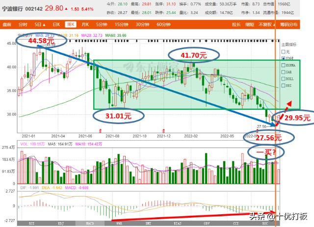 上图是宁波银行的周K线走势图。我们把月线的最后一笔【44.58-19.52元】放到周线上来分析一下。从图中的划分,我们可以清楚地看到两段走势,即【44.58-27.56元】的下跌走势和【27.56-29.95元】的上涨走势。前一段下跌走势有一个次级别走势扩展而来的下降中枢,同时出现了盘整背驰和MACD底背离,所以我们判定其走势已经完毕。后一段上涨走势,目前走出了一买27.56元和一买后的向上一笔【27.56-29.95元】。目前股价就是处于周线一买27.56元后的向上一笔【27.56-29.95元】形成阶段当中。