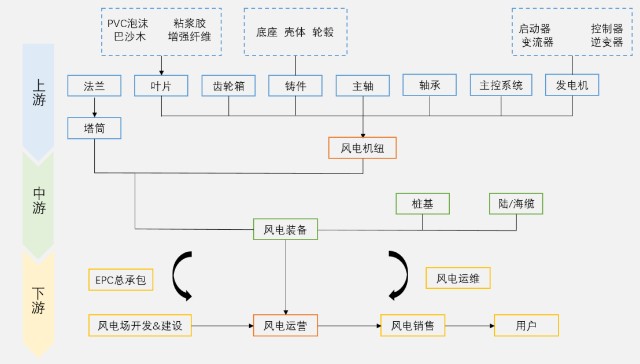 作为新能源大产业链下的一环,风电产业链由三部分组成,上游原材料及零部件、风机组装和风场运营。近年来,在国家政策的大力扶持下,风电设备制造业进入了成长期,尤其是在国内的能源供需矛盾问题突出和电力需求上升的情况下,风电产业有望得到迅速发展。
