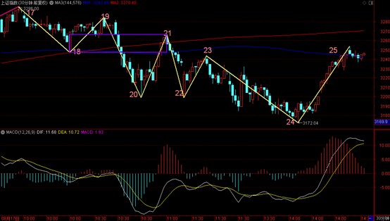 2. 5分钟图重点关注5分钟ma576(目前数值为3224.62)得失!守住,5分钟级别就处于牛市,否则,确认30分钟顶分型演变成笔。
