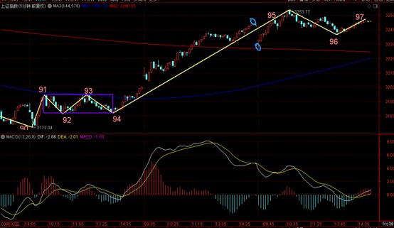 由于9495突破5分钟级别中枢(3181.96、3194.67)的同时,还突破了5分钟ma576,且回踩的1笔9596既未跌破中枢上沿,也未跌破5分钟级别的ma576,所以说5分钟级别走势强劲,并且还有继续向上冲的动力。但如果向下调整,就密切关注5分钟级别的ma576(目前数值为3224.62)的得失。