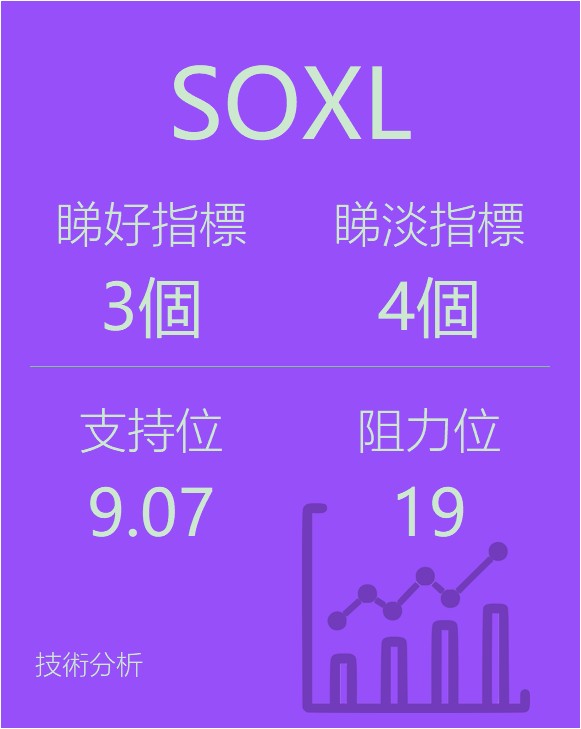 美股个股指标分析-$三倍做多半导体ETF-Direxion Daily(SOXL)$ 看好指标3个,看淡指标4个。支持位9.07,阻力19,仅供参考。