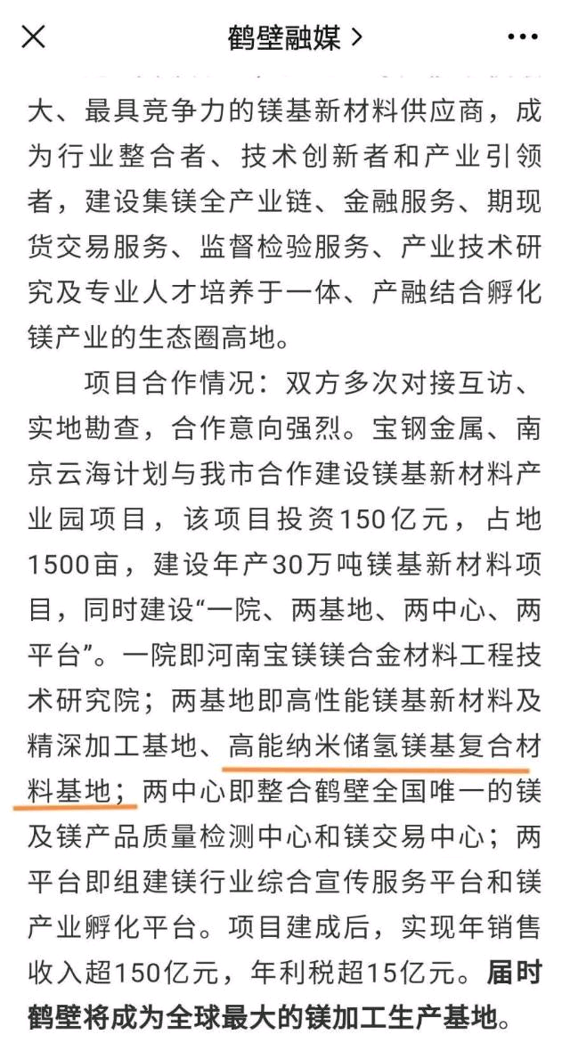 宝钢金属、南京云海计划与鹤壁市合作建设镁基新材料产业园项目,该项目投资150亿元,占地1500亩,建设年产30万吨镁基新材料项目,同时建设“一院、两基地、两中心、两平台”。一院即河南宝镁镁合金材料工程技术研究院;两基地即高性能镁基新材料及精深加工基地、高能纳米储氢镁基复合材料基地;两中心即整合鹤壁全国唯一的镁及镁产品质量检测中心和镁交易中心;两平台即组建镁行业综合宣传服务平台和镁产业孵化平台。项目建成后,实现年销售收入超150亿元,年利税超15亿元。届时鹤壁将成为全球最大的镁加工生产基地。