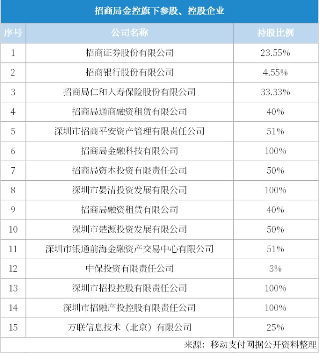 根据目前的工商信息,招商局金控旗下参股、控股企业共15家,包括招商证券、招商银行、仁和人寿等。