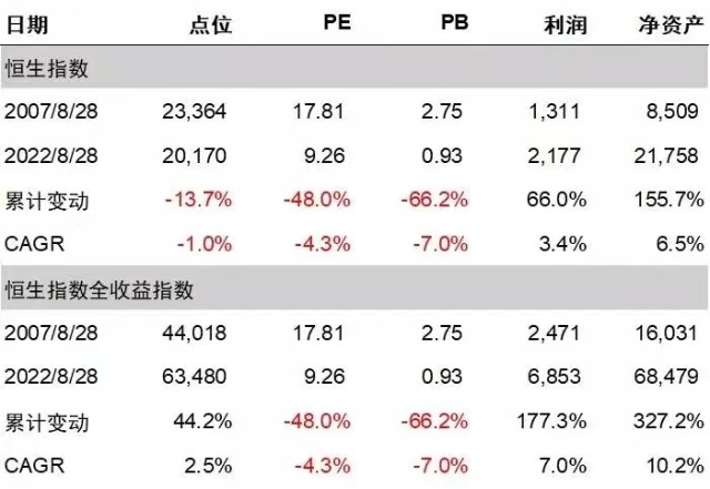 如果将期间现金分红加回去,这15年间恒生指数成分股的利润年化增长7%,pe年化-4.3%,合计结果是15年累计收益44.2%,折合年化2.5%。