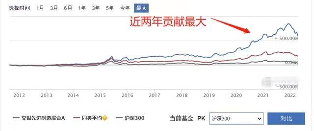 这6只基金里,最高的是交银先进制造,年化收益是23.44%。但它的业绩主要是2020年和2021年贡献的。根据均值回归理论,但它大幅跑赢市场后,很可能就会跌得很惨!
