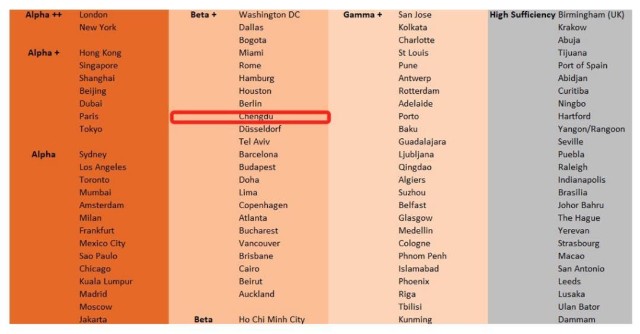 2020年,全球权威城市评级机构GaWC(全球化与世界城市)发布《世界城市名册2020》,在这个全球城市分级排名中,成都是唯一获得+评级的中国城市。