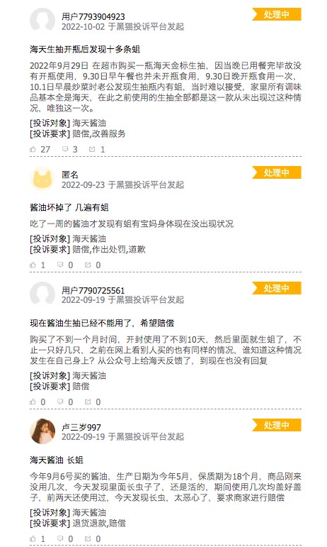 另外,在黑猫投诉平台,海天酱油最近30天内获得了5次投诉,这5条投诉都在说海天的酱油生抽产品出现了有蛆虫的问题。