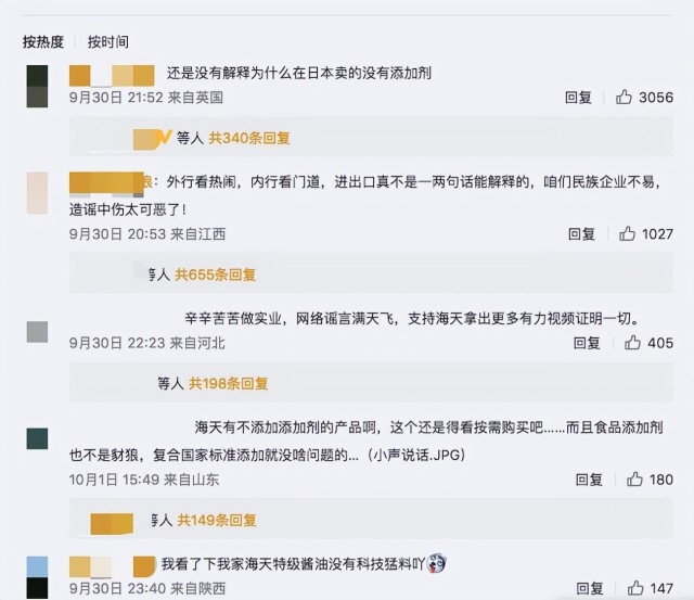 目前在海天味业这条声明下留言点赞最高的一条是:“还是没有解释为什么在日本卖得没有添加剂。”