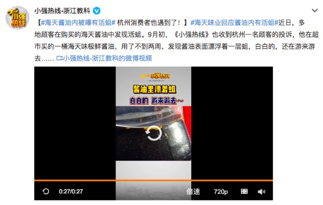 湖北经视的官微在今年8月份也曾报道过湖北武汉的一位消费者,他在7月底买了海天的生抽酱油,用过2次之后,第三次就发现产品中出现了蛆虫。对此商家表示愿意退货退款,但消费者对于这个处理并不满意。湖北经视还通过电话采访了海天味业的工作人员,他们的反馈是:酱油毕竟已经开了封,有可能是保存不当引起的,对于海天的产品质量他们是有信心的,出厂时肯定不会有任何异物,每批产品的质检报告也是有的,符合国家标准。
