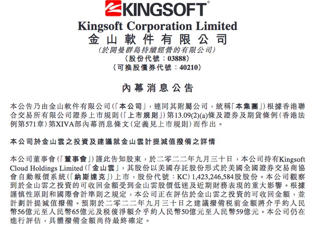 10月6日,金山软件又发布一份内幕消息公告,披露金山软件于金山云的投资可回收金额受到金山云股价低迷以及近期财务表现的重大影响,计划计提减值拨备56亿元至65亿元,税后净额介于50亿元至59亿元之间。因此金山软件也预计截至2022年9月30日的前三季度,将录得重大亏损。