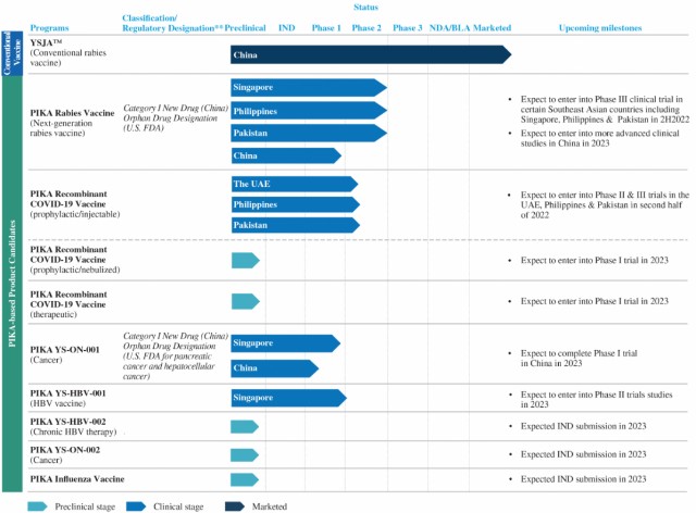 在研产品皮卡狂犬病疫苗是全球首创的治疗性狂犬疫苗,可用于狂犬病暴露后快速提供免疫保护,该产品已被世界卫生组织列为新型疫苗,并被国家药监局(NMPA)列为治疗用生物制品。美国FDA已授予该疫苗暴露前和暴露后预防狂犬病毒感染的孤儿药资质。皮卡狂犬病疫苗已于2022年7月在新加坡获批III期临床试验,在越南、菲律宾、巴基斯坦市场的III期临床试验预计在年内第四季度启动,中国临床试验也在同步推进,公司也在为该产品的大规模投产做准备。