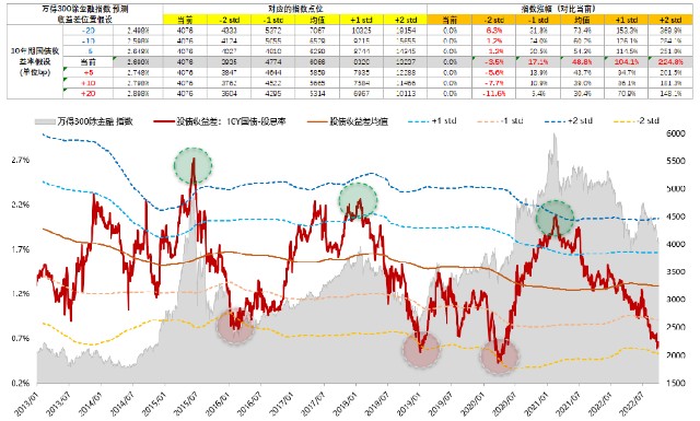 这个指标一旦大幅下行,背后是:一方面,国债利率大幅回落,体现债券市场对经济基本面的悲观。另一方面,股价快速下跌导致股息率的提升,反映市场对股票基本面的担忧。两类资产价格的变化,都指向对整体基本面的悲观,意味着整个资本市场越来越恐慌。反过来,如果这个指标大幅上行,那就折市场对基本面非常乐观的情绪。