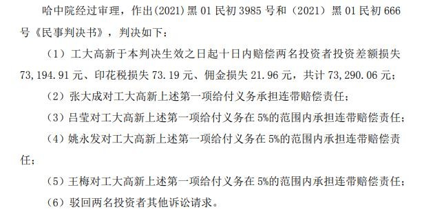 关于投资者就证券虚假陈述提起的民事赔偿诉讼,2022 年 7 月 1 日至工大高新《2022年半年度报告》财务报表签发日,共有 124 名投资者向哈尔滨市中级人民法院提起诉讼,请求判令工大高新等赔偿原告投资差额损失、佣金等合计 986.35 万元及诉讼费用。