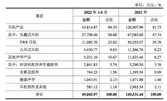 其中耳机产品在报告期内的占比分别是86.3%、94.14%、91.73%和89.33%。在2019年到2021年呈现出占比上升趋势。